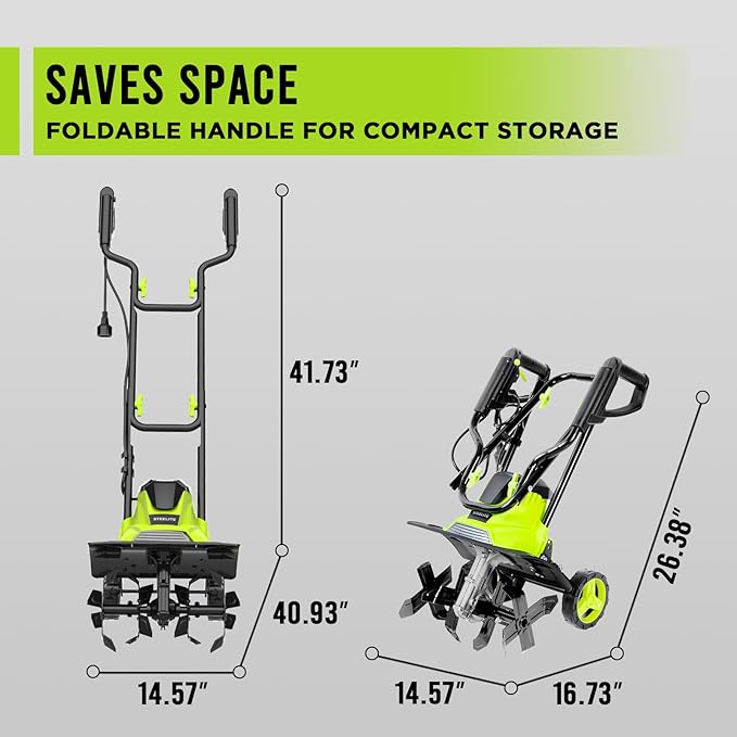 - Convenient Storage: The foldable handle design ensures easy storage and transport, making this electric tiller a practical choice for gardeners with limited space