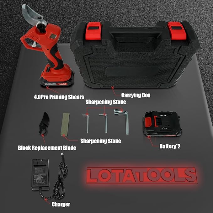 - Wide Application: The electric pruners have a wide range of applications. They can be used in gardens, parks, farms, orchards, greenhouses, etc. They can be used to trim grapevines, cherry trees, apple trees, etc. They are 8-10 times more efficient than manual pruning shears.Package Contents: Small Wrench x 3, Sharpening Stone x 1, Electric Shear x 1, Replacement Blades x 1 Pair, Battery x 2, Adapter x 1, Gloves x 1 Pair, Use manual x 1, Storage Case x1.