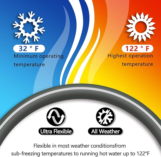 - Defying the Elements, Suitable for All-weather: Don't let extreme temperatures hold you back! Our garden hose is engineered to conquer the heat of summer and the chill of winter. Its low/high temperature resistance ensures that it remains flexible, reliable, and ready to perform, no matter what Mother Nature throws your way.