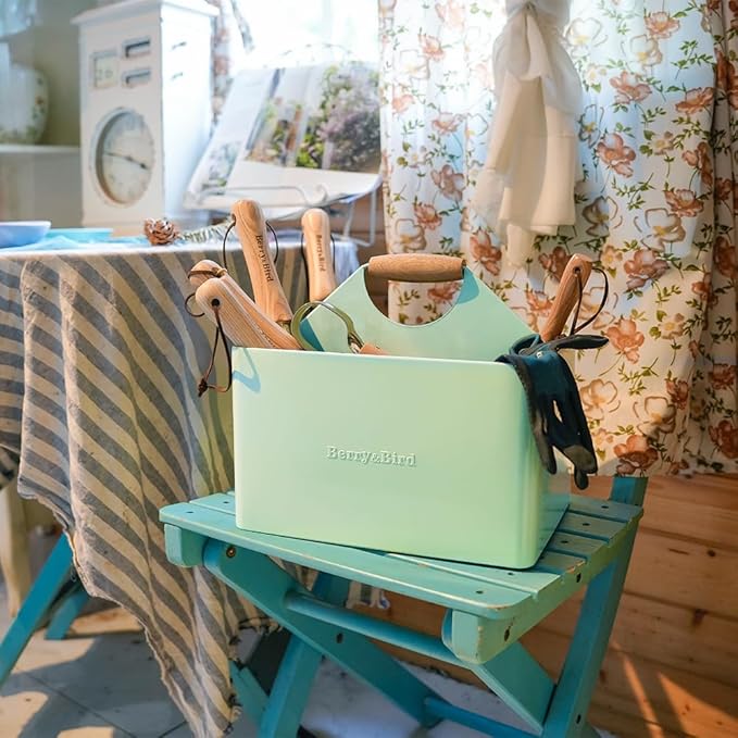 - Sturdy Construction- The Berry&Bird garden tool storage is crafted from premium rust-resistant metal, ensuring durability and no color fading. The unique green color scheme, adds a charming and nature-inspired touch to this garden tool basket, making it a delightful accent piece for any setting. This garden caddy provides a sturdy and long-lasting solution for organizing your gardening supplies with ease.