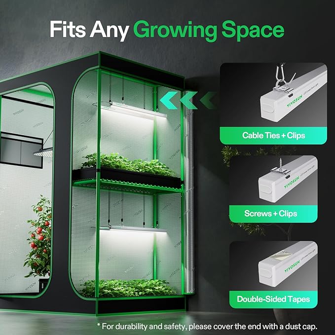- Flexible Installation Options: Offers three installation methods and a daisy chain design with two connection options to fit any grow space; Hang with cable ties, fix with screws, or stick with double-sided tape; Connect via extension cables or directly with connectors; Includes all accessories