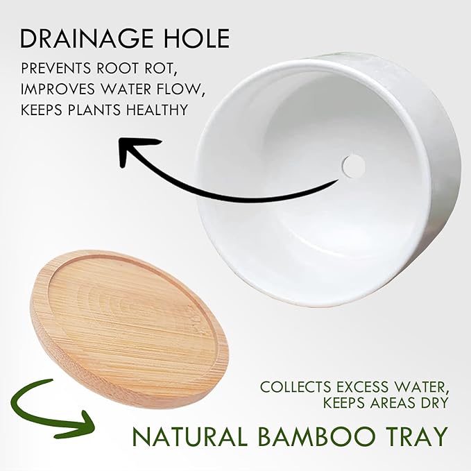 - Wood Tray and Central Drainage Hole: Each succulent pot includes a wooden tray to collect excess water, protecting your surfaces from stains. The central drainage hole at the bottom allows water to escape