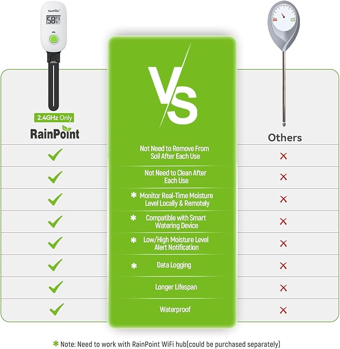 - 【🌿Build Auto-watering System】RAINPOINT provides the Exclusive Solution on Smart Watering. By pairing with the hub, the soil meter can work with other RainPoint smart devices (up to 39 devices) to form an auto-watering system. That will empower you to nurture healthy and thriving plants effortlessly. Ensure your plants thrive with this meter and enjoy healthy, flourishing greenery all year round.