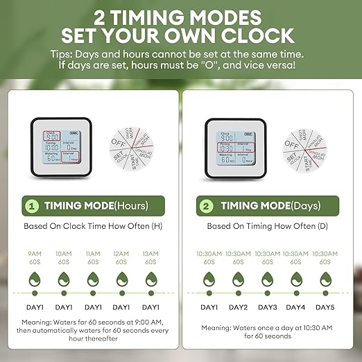 - Customizable Scheduling: The automatic plant watering system with water timer offers DIY customization, with watering durations ranging from 1 to 300 seconds and frequencies ranging from 1 hour to 30 days, ensuring that your plants stay well-watered with minimal effort (note: the number of days and hours between time intervals cannot be set at the same time; if you set the number of days and hours, it must be “0 “ and vice versa!)