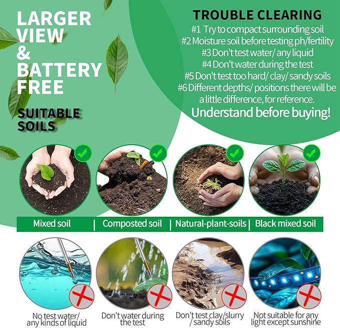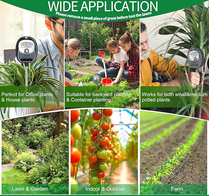 - NO Require Battery & Widely Use: This 4-in-1 soil test kit doesn't need an extra battery and is upgraded with a durable single soil testing probe which less hurts the roots, and can detect complex soil conditions(mixed-soil), can widely be used for indoor&outdoor garden, and all stages of Organic-gardening/Ornamental-Landscapes/small-trees/composting/pots, etc, You can buy one to understand more about your soil and enjoy the planting and harvest