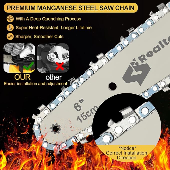 - [365-DAY WARRANTY] – Our Realtopdo 6 inch chainsaw set, compatible with 20V batteries, is made from flame-retardant and environmentally friendly materials, ensuring both safety and durability. We are confident in the quality of our product, which is why we offer a 365-day warranty—no need to return the product. If you experience any issues, simply contact us, and we'll resolve the problem within 24 hours
