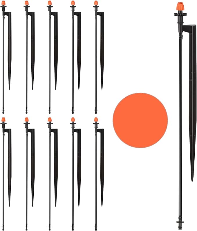 - Package Contents: The package includes 10 drip spray emitters mounted on 12-inch stakes, ready for installation. Each emitter is equipped with a stake for easy placement and stability in your garden. Additional 16" length 1/4" tubing is also provided to ensure you have everything needed for a complete irrigation setup