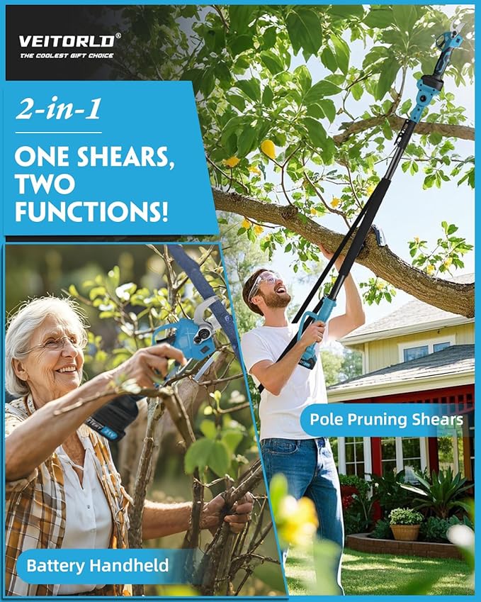 - 2-IN-1 ELECTRIC PRUNING SHEARS WITH EXTENSION POLE: Easily switch between handheld mode and extension pole mode; whether it's low shrubs or high branches, you can trim them with ease, all with one tool, making it the ideal choice for your gardening needs