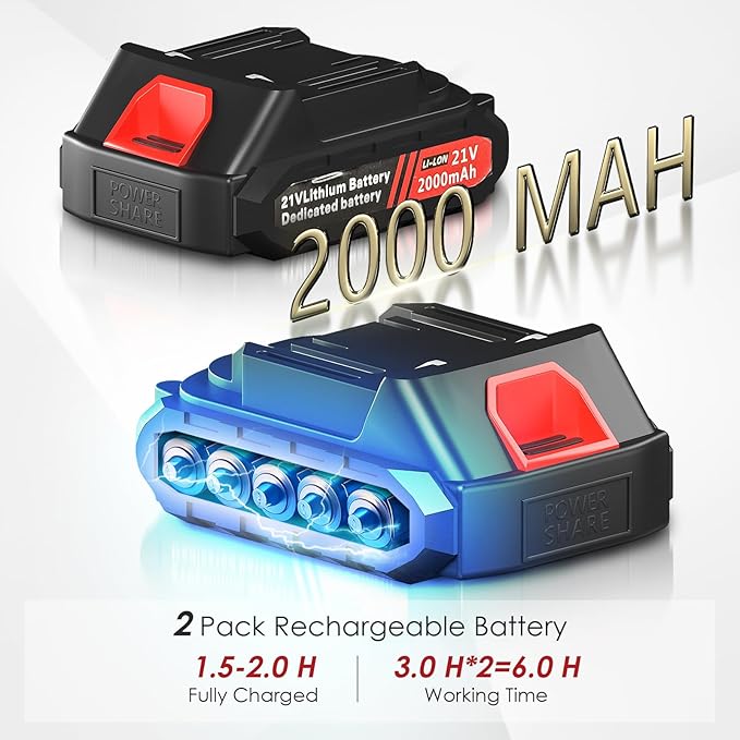 - High-Performance Battery and Power Indicator: This tree pruner comes with two 21V 2000mAh rechargeable batteries, eliminates charging worries. They all have overload and temperature protection, which extends battery life. LED screen and power indicator are included, accurately record battery level and eliminate battery anxiety.