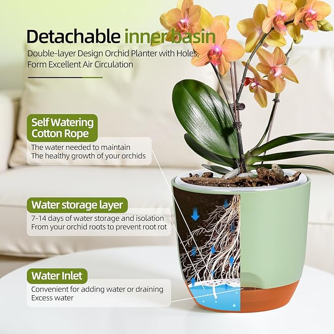 - AT EASE - SELF WATERING: Store a certain amount of water for orchids(7-14 days). The bottom of the inner-pot is always above the water surface to ensure that the roots are not submerged, and excess water will overflow from surrounding holes
