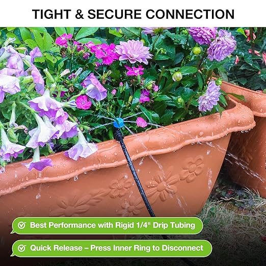 - Hassle-Free DIY Installation: Designed for standard 1/4-inch drip tubing, this kit lets you snap in adjustable drip irrigation emitters and irrigation drippers with no tools. Even a beginner can click on the drip irrigation mister heads or micro sprinkler heads and start watering in minutes. Set up your custom drip irrigation system in moments.