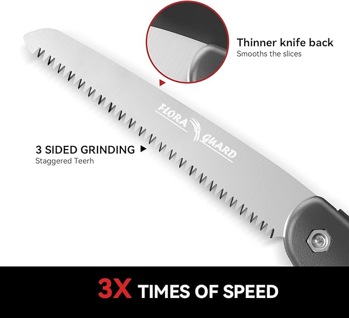 - FLORA GUARD camping saw is easy to open & close with a lock. Which keeps blade firmly in place during use and prevent the accident of folding saw blade falling or gripping by impacting, beside, it ensures safe when not in use. Dedicating to make a better tools for gardeners