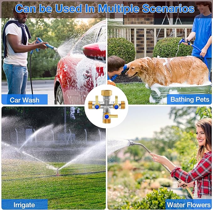 - 【Wide range of uses】Connect multiple hoses to work at the same time, irrigate plants and gardens, cover a larger area and supply water efficiently. Camping trip diverter expands the water supply for RV. Do it at the same time, water the plants in the yard or water the car when washing it. Bathe your pets and play with your kids in the garden and yard in the summer. It can also be used for a variety of irrigation systems, including misting, sprinkler and drip systems.