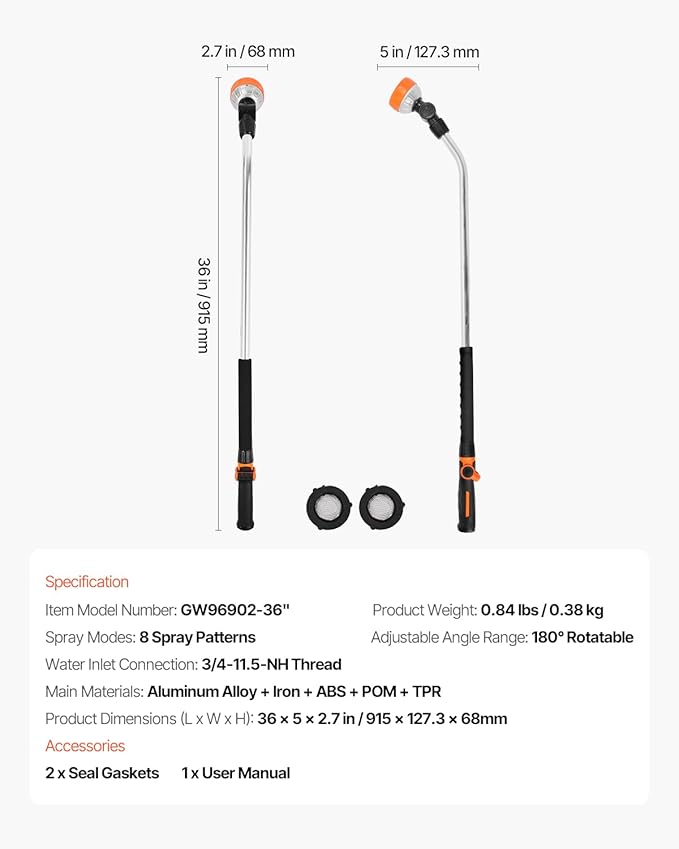 VEVOR Watering Wand, 36-Inch Extra Long Heavy Duty Garden Hose Wand with 8 Spray Patterns & 180° Swivel Head, Long Hose Nozzle Sprayer with on/off Thumb Control, Ideal for Hanging Baskets