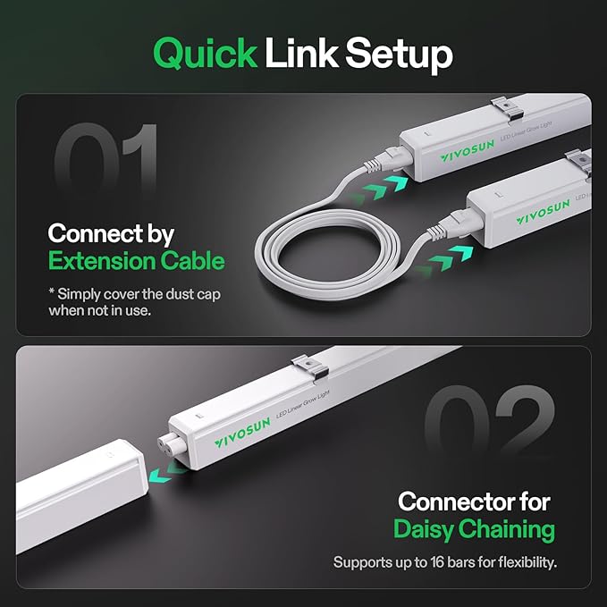- Flexible Installation Options: Offers three installation methods and a daisy chain design with two connection options to fit any grow space; Hang with cable ties, fix with screws, or stick with double-sided tape; Connect via extension cables or directly with connectors; Includes all accessories