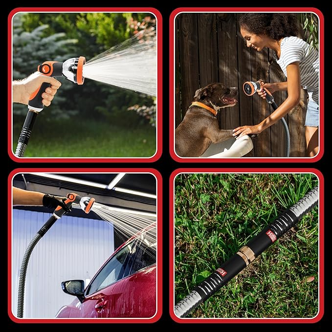 - UNBEATABLE DURABILITY: Crafted from premium 316 stainless steel—40% stronger than 304 steel—our Hyper hose is the ultimate garden hose, built to outlast traditional rubber hoses with unmatched strength and resilience with added 2% Molybdenum material and multi-layer flexible inner tube, its structure is stronger than traditional rubber water pipes or expandable / pocket hoses. Also, it can withstand dog bite, dragging through wall edges and ground, and will not break, crack or leak.