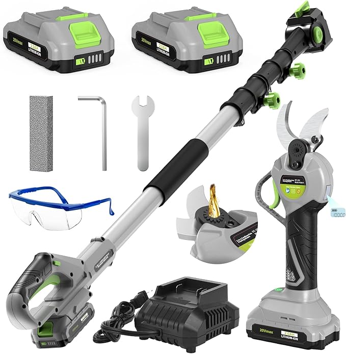 - 【Lightweight & Ergonomic Pole Pruning Shear】- Weigh 1.6 only pounds equipped with an LCD digital display counter. Designed for comfort, it’s easy to maneuver and reduces strain on your hands and wrists. You will get: Electric tree trimmer x1, 8.8 ft Telescopic Extension Pole x1, 2000mAh Battery Pack x2, Power Adapter x1, 1 Pair Goggles, Manual x1.