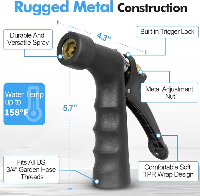 - High Pressure Flow: Industrial hose nozzle made of zinc alloy and TPR for hot and cold water use. Rupture pressure 600psi / Working pressure 200psi. The nozzle can be used for soft watering of the garden yard or for powerful high pressure for car washing, floor cleaning or industrial use