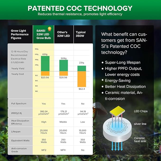 - Patented Ceramic Technology: Take your indoor gardening to the next level with SANSI's patented ceramic technology. Unlike traditional aluminum-based LED bulbs, SANSI’s innovative design uses a non-conductive ceramic heat sink that directly solders the LED chip. This results in superior heat dissipation, enhanced reliability, and improved light efficiency, extending the lifespan of your grow lights and promoting healthier plants