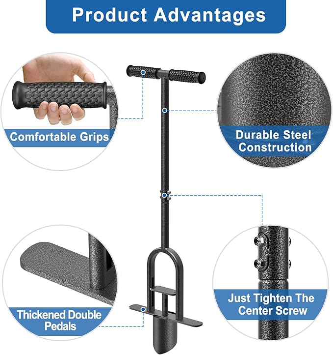 - Eject Soil Plugs with Step On The Middle Pedal: The lawn plugger tool has an innovative pedal in the middle that allows you to eject the soil plugs with a simple foot press. This makes it easy to dig continuously without having to turn the tool over or manually remove the soil.