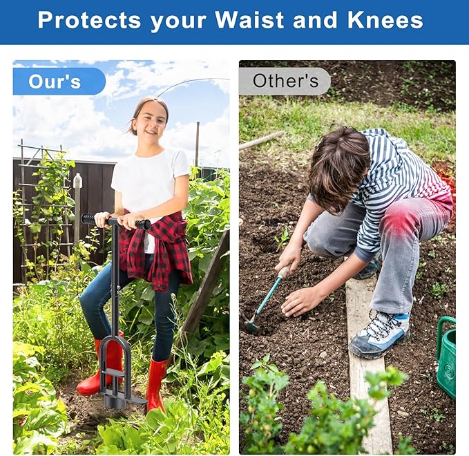 - Long handle bulb planter tool: The grass plug tool has a long handle that can be operated comfortably while standing, effectively relieving hip and back strain. And there is a comfortable T-shaped non-slip rubber grip design to reduce hand fatigue and prevent blisters.