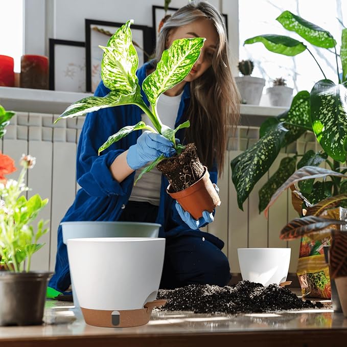 - 【Triple-Size Bottom Watering Pots Set】The 8-inch pot (basil/mint) fits kitchen counters; 10-inch sustains bathroom pothos & bedroom snake plants; 12 inch large indoor plant pot anchors living room fiddle leaf figs. Each size's cotton wick auto-adjusts moisture for 1-2 weeks. Fit for the majority of plants.