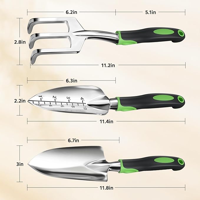 - 【All-in-One Gardening Kit】This 3-piece set includes a trowel, transplanter, and cultivator, providing all the tools you need for planting, digging, and soil cultivation. Enjoy exceptional value and versatility solution that makes your gardening more enjoyable, and more efficient.
