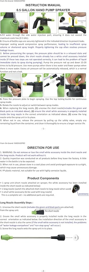 - 2 Adjustable Nozzles: Garden sprayer includes a short nozzle and a long nozzle, featuring both atomization and water column dual water outlet modes. You can easily switch between them by rotating the spray head