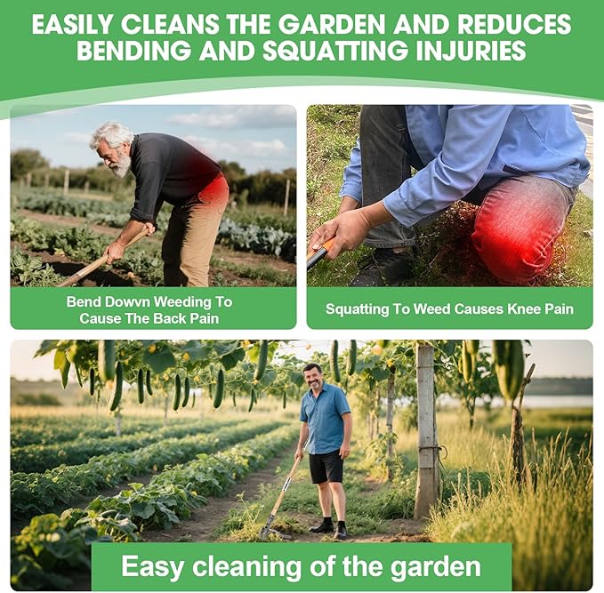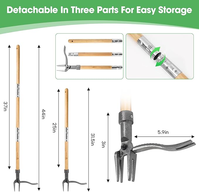 - Adjustable & Space-Saving:Split the handle into 3 sections for compact storage (31.5" shortest length) or adjust for user height. The built-in hanging hole keeps your garden weeder neatly stored—ideal for small sheds or garages