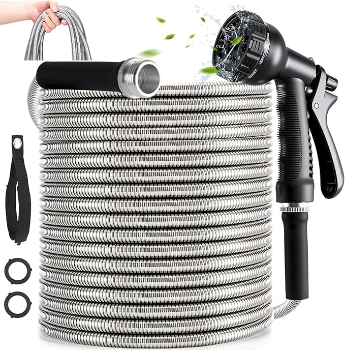 - 【10 Spray Nozzles】: The stainless steel hose flexible is equipped with 10 functional nozzles to ensure the perfect spray pattern for all kinds of gardening jobs, from a light mist for delicate plants and flowers to a powerful spray for cleaning hard surfaces. In this way, whether you are watering your garden or hosing down your patio, this 50 feet metal garden hose can easily meet your needs, providing great convenience for your outdoor and indoor watering and cleaning needs!