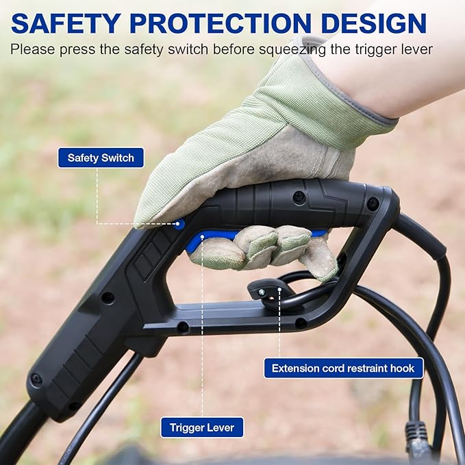 - High-Power AC Motor: This electric tiller powered by 13.5-Amp AC motor that speed up to 19,000RPM, effortlessly cultivating soil up to 16" wide and 8" deep.