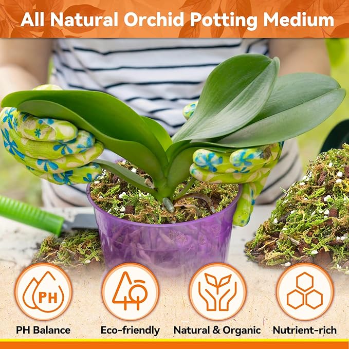 - Premium Orchid Potting Mix: This orchid repotting kit is carefully formulated with bark, perlite, coco peat, and forest moss, using 100% natural materials, ensuring that plants grow in a healthy medium, making it perfect for various orchid species, especially epiphytic orchids like phalaenopsis, cattleya, and dendrobium, helping your orchid roots grow strong and healthy