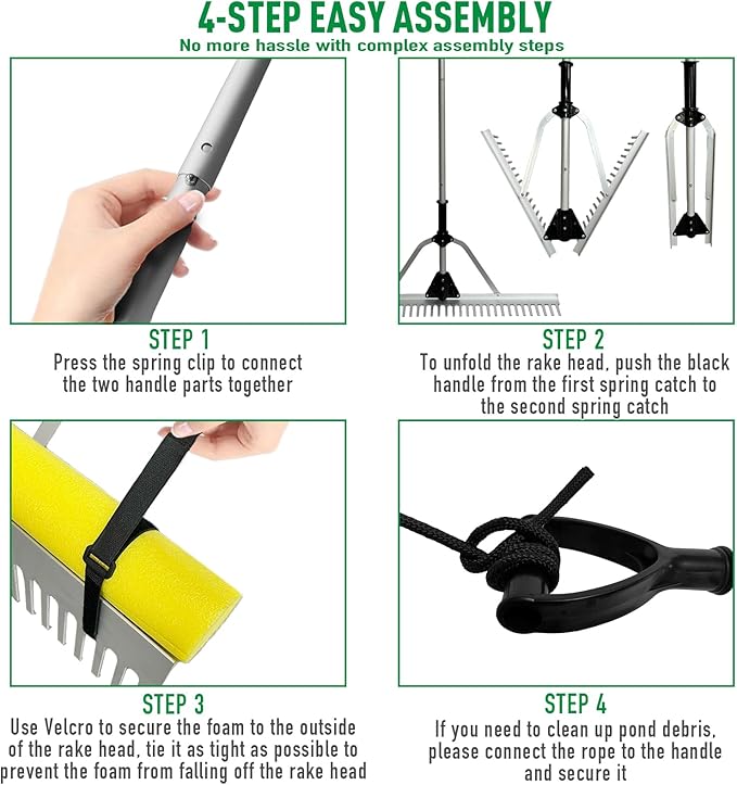 - 【QUICK AND EASY SETUP】This lake rake features a convenient 4-step spring-lock assembly, allowing for quick setup and takedown. With a two-level adjustable handle length, it adapts effortlessly to various cleaning tasks. The 90° foldable rake head design also makes it easy to store in compact spaces, saving room in your garage or shed.