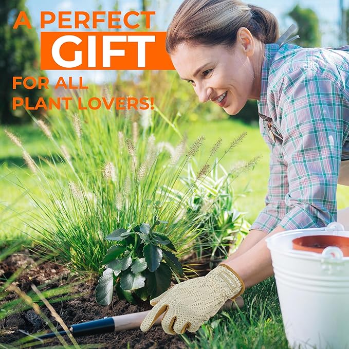 - Durable & Comfortable: Crafted from ultra-soft, premium goatskin leather, these women gardening gloves feature a durable and flexible surface that resists scratches, scrapes and abrasions. Reinforced stitching ensures long-lasting durability, ensuring your hands stay safe and comfortable during your gardening tasks