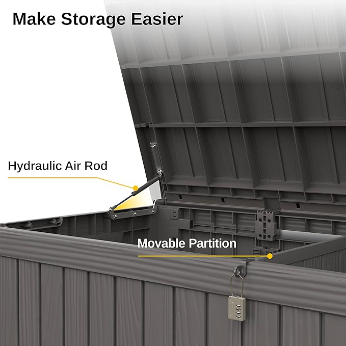 - π¦πππ π’π£ππ₯ππ§ππ’π‘: EAST OAK outdoor storage box features a hydraulic lever design for safe use, eliminating hand-pinching risks during opening and closing. It includes a removable internal partition for organizing outdoor items neatly.