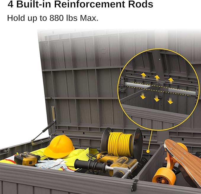 - π¦π¨π£ππ₯ππ’π₯ ππ’ππ-ππππ₯ππ‘π π£ππ₯ππ’π₯π ππ‘ππ: Four built-in reinforcing rods let the patio storage box support heavy outdoor items without bending or warping. It can double as a patio seat or extra table for outdoor leisure use.