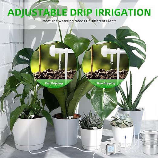 - 【Auto Garden Watering System】: The plant watering devices can program the drip irrigation kit set a regular watering schedule based on the water needs of your plants. When you're busy at work or enjoying a trip with family and friends, it will automatically hydrates your plants precisely, ensuring your garden is full of life and beauty.