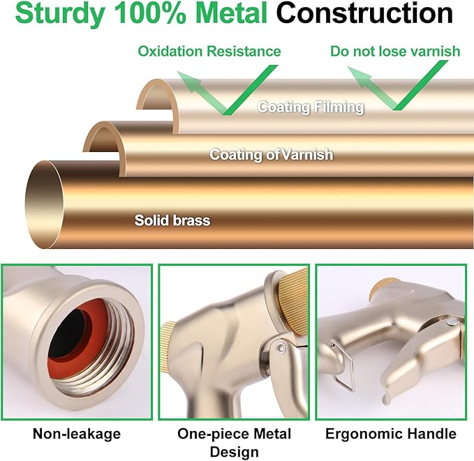 - Upgraded Hose Nozzle: Made of pure metal, the MYWERO upgraded hose nozzle is ultra-heavy-duty, featuring a zinc alloy outer coating, while the inner body and trigger are made of solid brass. High quality prevents leaks, rust, corrosion, and wear, making it more durable than plastic nozzles.