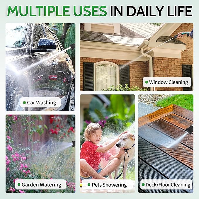 - Versatile Applications: Our garden spray nozzle is perfect for a wide range of tasks, including watering flowers, washing cars, cleaning windows, and giving pets a bath—even horses! The jet mode effortlessly blasts away stubborn dirt, while the gentle shower mode is ideal for tender blooms in your garden. Whether at home, on the lawn, or in the garage, this nozzle is your trusted multi-functional tool.