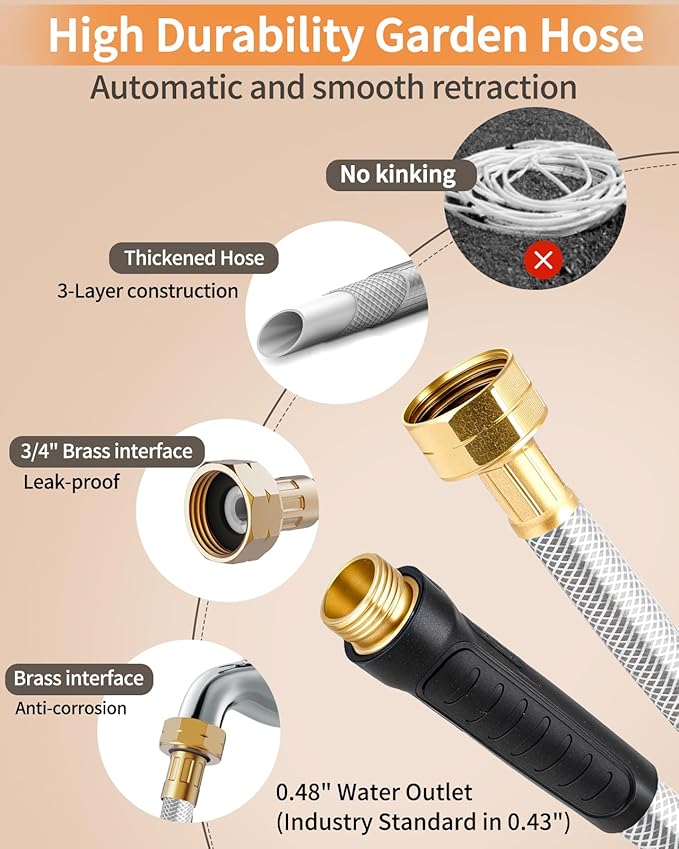 - 【Upgraded & Thickened Durable Retractable Hose】Our retractable outdoor hose reel wall mount is made of high-quality reinforced 3-layer composite material, and has passed the 200PSI pressure test, ensure the retractable hose reel is leak-proof and durable, equipped with rubber protective sleeve and 3/4" copper metal connects, it guarantees a leak-free performance.
