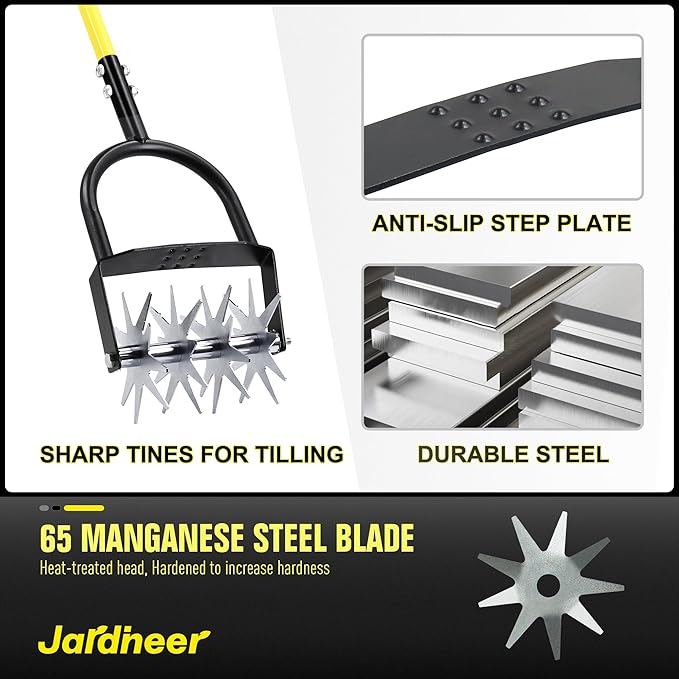 - 【Multi-Functional Soil Prep & Aeration】Versatile Lawn Tool – Cultivates, aerates, and mixes soil with ease. Crisscross tilling technique breaks up hard clumps faster, improving drainage & root growth. Perfect for vegetable beds, flower gardens, and lawn reseeding