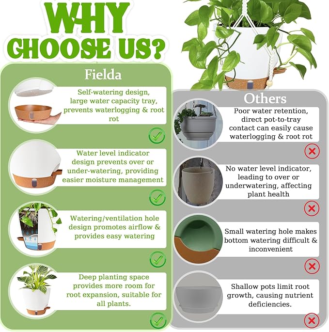 - 【Never Over/Underwater Again!】Fielda's indoor hanging planters feature an EXCLUSIVE WATER WINDOW in the base tray - instantly check moisture levels without guesswork! Protect your plants from dehydration and promote healthy root systems with this visual watering guide. Perfect for hanging pots for indoor plants enthusiasts who value scientific plant care.