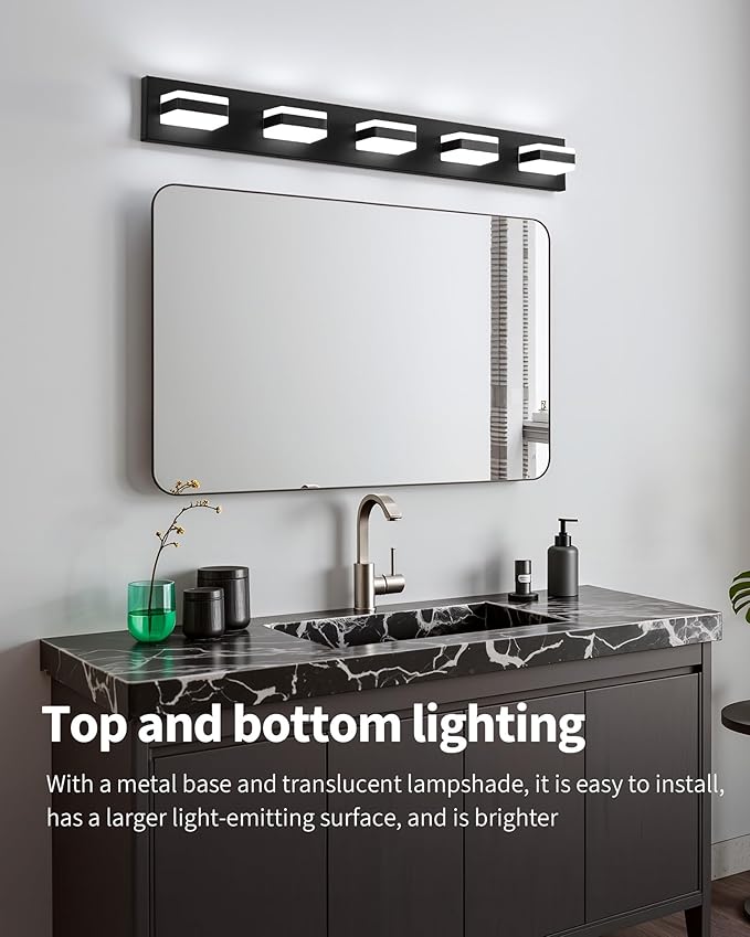 - 5000K Versatile Over-Mirror Lighting: Featuring FIVE energy-efficient 30W LED bulbs in 5000K cool white—lasting longer than traditional bulbs while cutting energy costs. Ideal above square/round mirrors in bathrooms. (Tips: Choose from 22-inch (3-light) to 38-inch (5-light) sizes. Combine multiples for seamless vanity lighting fixtures in large spaces)