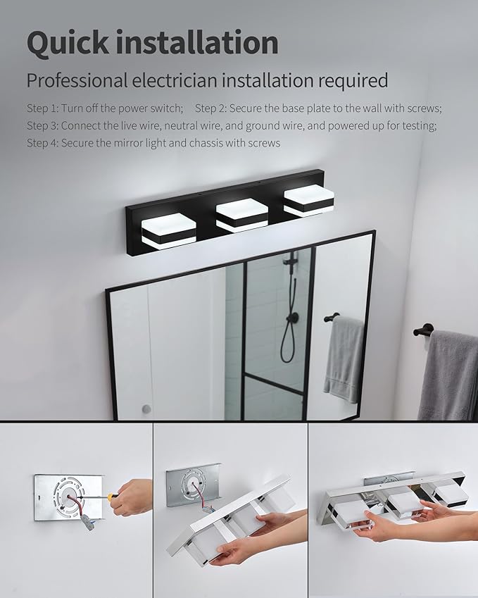 - Easy to Install: This modern vanity light features and installs in just 15 minutes. Equipped it is hardwired to fit a standard US backplate, requiring no additional assembly. The fixture mounts above the mirror and is ready to use by connecting to the pre-wired connections and securing it to the wall.