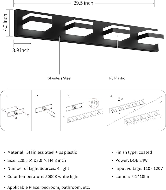 - 5000K Versatile Over-Mirror Lighting: Featuring FOUR energy-efficient 24W LED bulbs in 5000K cool white—lasting longer than traditional bulbs while cutting energy costs. Ideal above square/round mirrors in bathrooms. (Tips: Choose from 22-inch (3-light) to 38-inch (5-light) sizes. Combine multiples for seamless vanity lighting fixtures in large spaces)