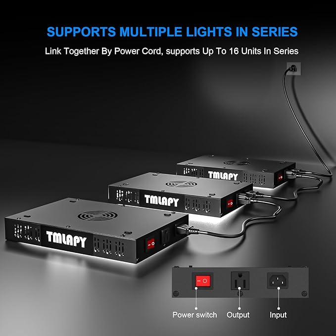 - đăDAISY CHAIN FUNCTIONăOur full spectrum grow light has daisy chain function. Attached with a 5ft daisy chain cable can be used to connect multiple lights together, but the total power in series cannot exceed 1000W.