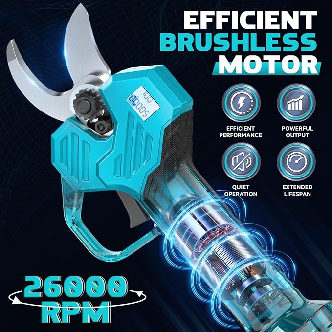 - Safety and Convenience: Equipped with a built-in safety lock mechanism, the portable pruning shears require a quick trigger press sequence to activate, preventing accidental start-ups. The lightweight design and LCD digital display for battery monitoring make every pruning task a breeze.