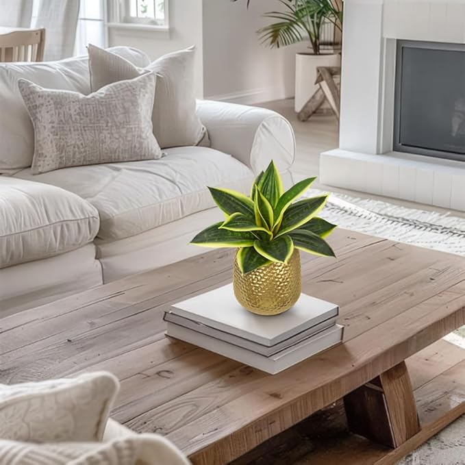 - Perfect Size: Faux snake plant in gold pots total height: 9", golden metal pot: 2.4 "W x 3.9 "H; Please read the dimensions carefully. Succulent agave plants artificial will easily catch you eyes, bring your home a vibrant sense of greenery