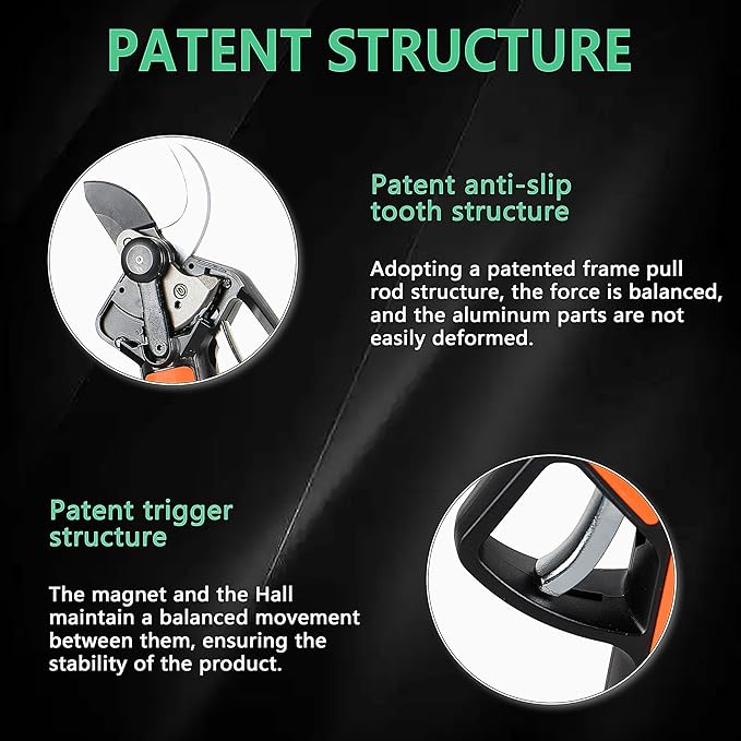 - 🔋 Dual 2600mAh Batteries & Patented Long-Life Design –-- Two rechargeable batteries provide up to 8 hours runtime. Patented anti-slip gear and track-style trigger withstand 300,000+ cuts, outlasting ordinary pruners by years.