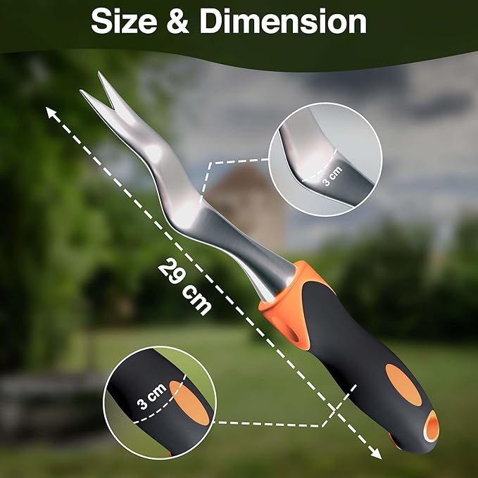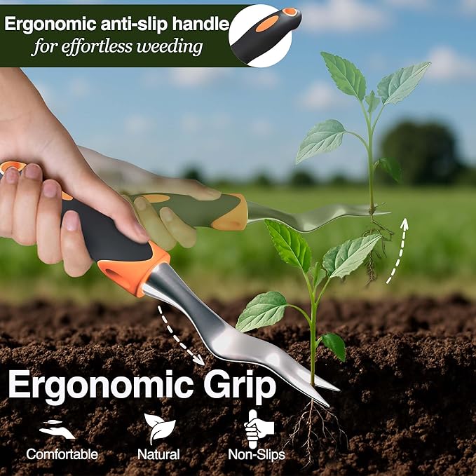 - 🌿COMFORTABLE GRIP FOR FATIGUE-FREE GARDENING: Our soft rubberized handle is designed for comfort and control. The non-slip surface ensures a secure hold even when wet or muddy. Ergonomically shaped to reduce strain on your hand and wrist, it makes hand weeder tool removal more enjoyable and efficient, especially during longer gardening sessions.